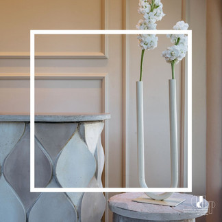 Todo el mobiliario fue elegido y diseñado especialmente para la clienta. Se crearon los tótems en cemento, hierro y tapa con distintos sobrantes de mármol. También se recurrió a ferias de antigüedades y remates para combinar los elementos con el estilo de la casona. El mostrador de la recepción se diseñó a medida con un revestimiento hecho artesanalmente con el mismo tono usado en las paredes en efecto degradé.